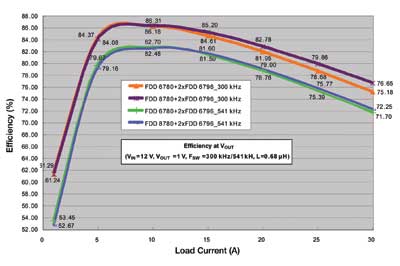 注意上面的兩條曲線,在滿載(30A)時(shí),可以看到最新的器件的效率有1.5%的改進(jìn)。同樣還是這兩條曲線,在負(fù)荷較?。?5A)時(shí),可以實(shí)現(xiàn)0.69%的改善。如果對整個(gè)負(fù)荷范圍積分,那么與今天常見的方案相比,使用最新的MOSFET器件時(shí)平均功率損耗可以降低8%~10%。即使在較高的開關(guān)頻率541kHz處,可以看到在負(fù)荷小時(shí)系統(tǒng)級效率仍然高于80%,而在滿載時(shí)效率大于70%。如果頻率繼續(xù)增加,那么開關(guān)損耗將急劇增加。
