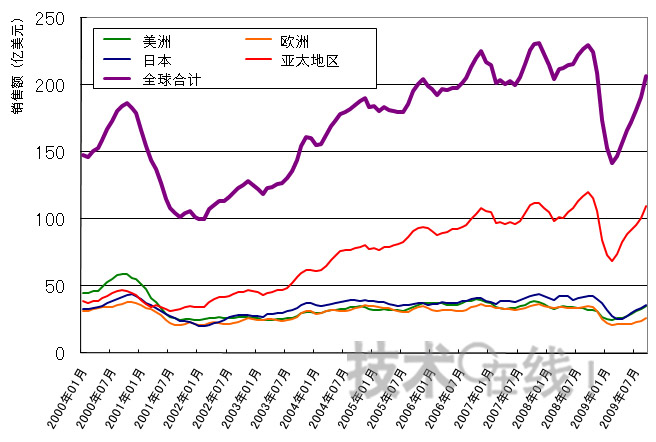 另外,這是自08年11月(208億7000萬美元)以來,單月銷售額首次超過200億美元。這一增長(zhǎng)率將持續(xù)下去。09年第三季度(7~9月)的銷售額為619億美元,較09年第二季度的517億美元大幅增長(zhǎng)了19.7%。與08年第三季度相比,跌幅縮小到了10.1%。另外,09年第二季度的銷售額比上年同期減少了20%。
