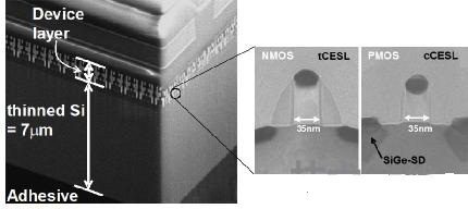 僅厚7μm的300mm晶圓的截面照片。采用45nm的CMOS邏輯元件工藝形成了MOSFET