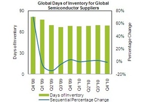整個2010年的DOI預計穩(wěn)定在接近70天的水平。半導體供應商打算在這一年中的四個季度都能保存庫存需求的平衡。