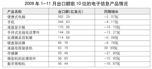 2009年1-11月,電子信息產(chǎn)品累計(jì)進(jìn)出口總額6868.78億美元,同比下降16.66%,比全國商品進(jìn)出口總額降幅低0.8個(gè)百分點(diǎn),占全國外貿(mào)進(jìn)出口總額的34.97%。