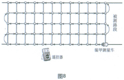 本方案是將具有記憶和存貯功能的TES—1333型照度記安置在高檔電動遙控的履帶式玩具裝甲車(以下簡稱為測試小車)上,該測試小車的驅(qū)動系統(tǒng)受站在路邊的測量者手中的遙控器和測試小車內(nèi)安置的可編程控制器為主體的自動控制系統(tǒng)控制,當(dāng)車內(nèi)的自動控制系統(tǒng)啟動時(shí),裝甲車將按照事先設(shè)定的動作程序沿如圖8所示的箭頭方向完成行走程序,并采用四點(diǎn)法在每個矩形網(wǎng)格的四角處自動完成照度測量和記錄,存貯任務(wù),待全部程序結(jié)束后,測試小車在遙控器的操縱下自動返回測量者所在位置。遙控器的另一作用是在車內(nèi)控制系統(tǒng)失靈的情況下,由測量者手動遙控完成全部的測量過程,并在道路出現(xiàn)行駛車輛時(shí)緊急召回測試小車。
