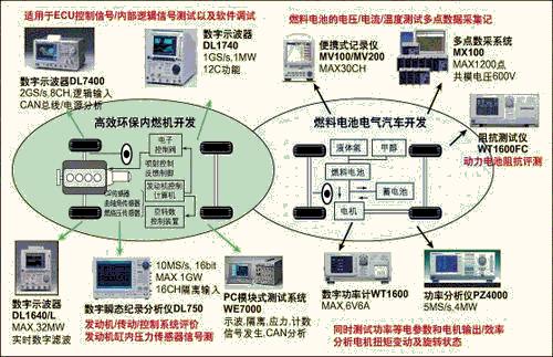 本文針對汽車研發(fā)過程中所涉及到的發(fā)動機(jī)分析、驅(qū)動分析、振動分析、環(huán)境影響、燃料電池效率分析、CAN總線分析等方面,介紹橫河電機(jī)提供的各種測試解決方案(圖1)。