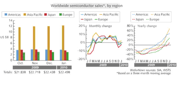 Semiconductor International 全球1月半導(dǎo)體的銷售額數(shù)據(jù)出籠,讓分析師們的眼睛一亮,紛紛提高2010年的預(yù)測(cè)。為什么如此迫不及待,值得思考。