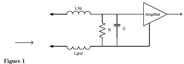 單端探頭有兩個(gè)輸入端——信號(尖端)和地。等效電路包括電感、DC電阻并聯(lián)的輸入電容和地夾的電感。地夾電感可以和尖端電感歸結(jié)在一起以簡化電路。有源探頭的等效電路如Figure1所示。給出的電感有兩個(gè)——尖端和地夾電感。地夾電感通常占主導(dǎo)地位并依據(jù)用戶連接待測系統(tǒng)地的方式而改變。