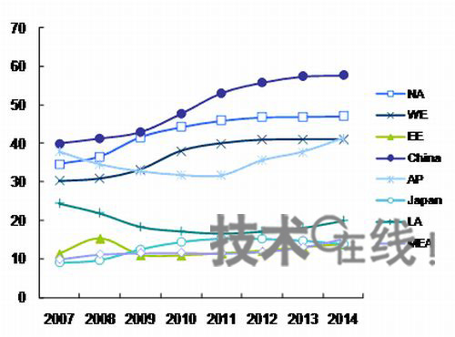 【2】按地區(qū)劃分的電視市場 2010年中國的電視市場規(guī)模將達到4800萬臺,按供貨量計算,規(guī)模為全球最大。其他新興市場國家的需求2010年也將開始恢復。到2014年,亞太地區(qū)的電視供貨量將超過西歐,新興市場國家將推動全球電視市場擴大。