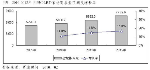 2010年4月13日,中國(guó)權(quán)威ICT研究與管理咨詢機(jī)構(gòu)賽迪顧問股份有限公司在“2010中國(guó)消費(fèi)電子市場(chǎng)年會(huì)”上發(fā)布《2009-2010年中國(guó)OLED產(chǎn)業(yè)發(fā)展研究年度報(bào)告》顯示:隨著手機(jī)和MP3/MP4等應(yīng)用產(chǎn)品需求的推動(dòng),OLED顯示屏市場(chǎng)自2003年開始快速成長(zhǎng),到2009年,全球OLED出貨量達(dá)到8780萬片,由于受到全球終端產(chǎn)品有所減緩的影響,特別是手機(jī)和MP3市場(chǎng)出貨量的下滑,加上PMOLED全球產(chǎn)量明顯降低,但AMOLED在得到面板廠商大力推動(dòng)下,特別是像諾基亞、三星、索愛等終端廠商,均在2009年推出一系列采用AMOLED屏幕的手機(jī),在應(yīng)用市場(chǎng)的推動(dòng)下,AMOLED有了較大的增長(zhǎng),不過OLED總體仍有所下滑。伴隨著AMOLED出貨量的增長(zhǎng)和市場(chǎng)比例的提升,OLED整體產(chǎn)值有明顯的增長(zhǎng),2009年產(chǎn)值達(dá)到9.05億美元,較2008年成長(zhǎng)31.2%,出貨量在下滑的同時(shí),而出貨額保持增長(zhǎng),AMOLED貢獻(xiàn)極為明顯。