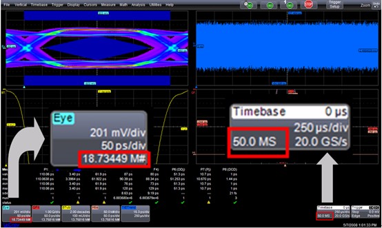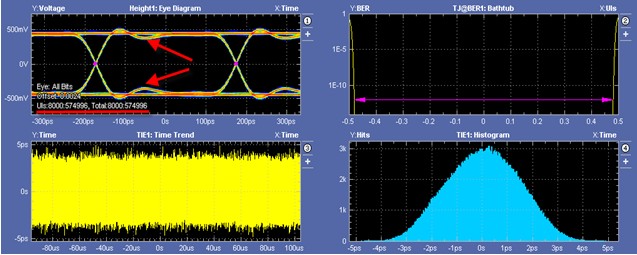力科示波器捕獲了50MS的數(shù)據(jù),并一次性地對所有這些數(shù)據(jù)進行眼圖測量,得到了18.73449M個比特位(UI)的眼圖。如下圖所示。