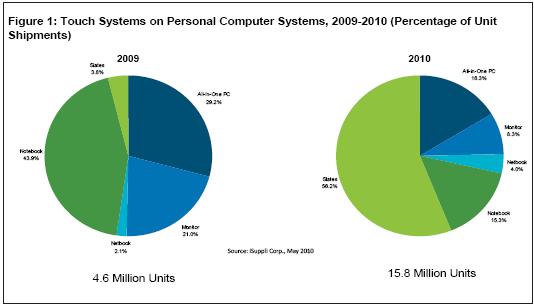 最近幾年,個(gè)人電腦市場(chǎng)對(duì)于觸摸屏的需求不斷增長(zhǎng),2008和2009年增長(zhǎng)率超過(guò)20%,快于總體系統(tǒng)市場(chǎng)。但與該市場(chǎng)2010年462%的增長(zhǎng)率相比,上述增長(zhǎng)速度就相形見絀了。平板觸摸電腦是PC觸摸革命中的主要初期推動(dòng)者,預(yù)計(jì)占PC觸摸市場(chǎng)的比例將從2009年的3.8%銳升到56.2%,而總體PC觸摸市場(chǎng)規(guī)模將擴(kuò)大兩倍。