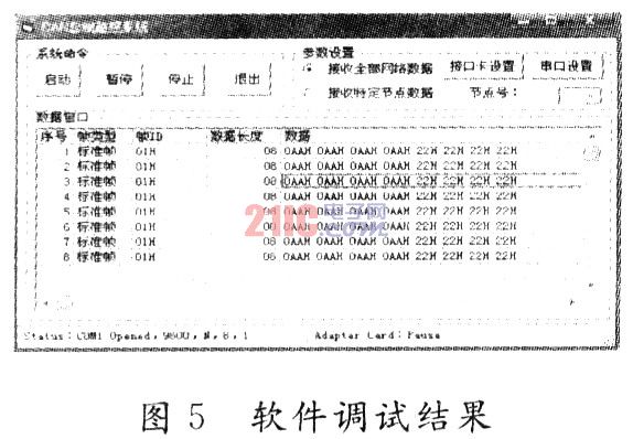 在該接口卡中作者采取了另一種轉(zhuǎn)義字符的方法。首先定義一個轉(zhuǎn)義字符標(biāo)識OXDBH。對于CAN總線而言,其每個幀的最大數(shù)據(jù)長度為8,即使將CAN的幀信息和識別碼全部當(dāng)作數(shù)據(jù)發(fā)送,其長度最大也只有13B。這樣可以肯定的是,正常情況下數(shù)據(jù)幀中數(shù)據(jù)長度字節(jié)的高4位必然為0。因此在數(shù)據(jù)發(fā)送之前,首先檢查該數(shù)據(jù)中是否有與起始字節(jié)0X22H、結(jié)束字節(jié)0X33H和轉(zhuǎn)義標(biāo)識0XDBH相同的數(shù)據(jù),如果沒有,則正常發(fā)送;如果有,則檢測出與這兩個字節(jié)相同數(shù)據(jù)的個數(shù),并將該個數(shù)填充到數(shù)據(jù)長度字節(jié)的高4位中;同時,將這些數(shù)據(jù)前添加轉(zhuǎn)義字符標(biāo)識,并將該數(shù)據(jù)進(jìn)行轉(zhuǎn)義。如數(shù)據(jù)0X22H。0X33H,0XDBH…,則轉(zhuǎn)義成0XDBH。0XD2H。0XDBH,0XD3H,0XDBH,0XDDH…。PC機(jī)在接收到數(shù)據(jù)幀后,首先檢查數(shù)據(jù)長度字節(jié),看其高4位是否為0,如果為0,說明該數(shù)據(jù)組不存在轉(zhuǎn)義字符,可以直接處理;如果為N。則表明數(shù)據(jù)組中存在N個轉(zhuǎn)義字符,并且每個轉(zhuǎn)義字符都以0XDB開始,需要首先將它們重新修改回原始數(shù)據(jù)。相比而言,這種辦法有很好的穩(wěn)定性和接口利用率,其數(shù)據(jù)流量也不會很高。