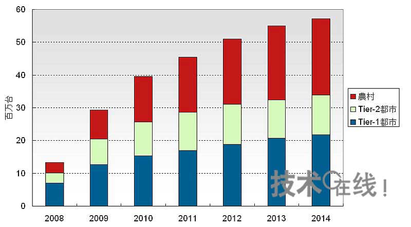 由于中國(guó)的城市人口不斷增加,2014年將超過(guò)中國(guó)人口的一半,達(dá)到56%,較10年前增長(zhǎng)14%。我們首次將中國(guó)的液晶電視需求按照“一線城市”、“二線城市”及“農(nóng)村”的劃分進(jìn)行了預(yù)測(cè)。在農(nóng)村,目前正在由顯像管電視向平板電視過(guò)渡,一線城市和二線城市每戶家庭擁有的電視數(shù)量將增加。根據(jù)經(jīng)濟(jì)的增長(zhǎng)程度,電視需求甚至有望超出預(yù)測(cè)。我們預(yù)測(cè),2014年中國(guó)液晶電視需求中,城市約占60%,增長(zhǎng)至3400萬(wàn)臺(tái)左右(圖2)。