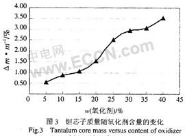 對(duì)于二步法生產(chǎn)工藝,單體為聚合反應(yīng)過程中的過量一方,聚合物生成的量由氧化劑的量來決定,聚合物在鉭芯表面的沉積數(shù)量隨氧化劑含量的增加而增加。從圖3可以看出,在相同的浸漬次數(shù)下,使用含量為5%的氧化劑陽極塊的質(zhì)量增加為0.54%,而使用含量為40%的氧化劑陽極塊質(zhì)量增加為3.52%,因此高含量的氧化劑可以有效增加聚合物的沉積量。
