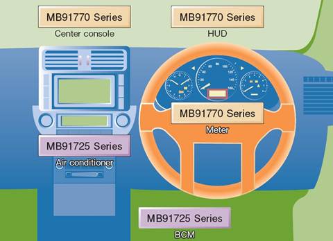 圖一 儀表盤控制及車身控制MCU在汽車中的應(yīng)用(以MB91770系列和MB91725系列為例)