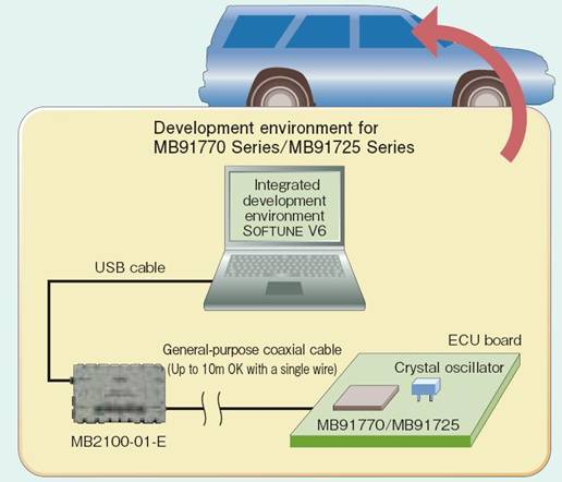 一般產(chǎn)品必須利用ICE主單元和驗(yàn)證用評(píng)估芯片來(lái)進(jìn)行系統(tǒng)檢驗(yàn),為了降低驗(yàn)證的復(fù)雜度,我們?yōu)樾乱淮鶰CU產(chǎn)品提供芯片上(on-chip)的偵錯(cuò)方式。它采用單線調(diào)試接口,可以實(shí)現(xiàn)汽車評(píng)估或一致性測(cè)試,并且能夠利用通用同軸電纜、在高達(dá)10米的范圍內(nèi)實(shí)現(xiàn)小型ICE主單元和目標(biāo)電路板之間的通信。這可以簡(jiǎn)化按照常規(guī)難以實(shí)現(xiàn)的汽車評(píng)估。