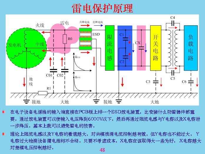 大家想想看,跟前面我們所說(shuō)的,感應(yīng)雷這個(gè)東西沒(méi)有一個(gè)標(biāo)準(zhǔn)的概念說(shuō)什么叫做感應(yīng)雷。只要打雷的話,外面打雷,窗戶上面的金屬,如果夜間都可以看到放電產(chǎn)生火花,這就是通過(guò)電磁感應(yīng)產(chǎn)生的位移電流原理。從原理上來(lái)說(shuō),三相四線或三相五線,發(fā)電機(jī)有中線接地,設(shè)備使用者的外殼接地是最有效的避雷方法,但現(xiàn)在很多設(shè)備都不接地,沒(méi)有辦法接,只有很貴重的進(jìn)口設(shè)備用三相電源,中間那一條地線,地線不是中線,大家要搞清楚。中線雖然是接地的,但在這里不能當(dāng)成地線,地線一定是自己大樓本身的地,而且要量好接地的地線。因?yàn)榈鼐€接進(jìn)去以后,大樓對(duì)外面的電磁層進(jìn)行屏蔽了,大樓相對(duì)來(lái)說(shuō)也是導(dǎo)電的,就算不導(dǎo)電,現(xiàn)在國(guó)家都有安全要求,大樓超過(guò)多少層都要加上避雷針,就是防雷的。如果不能接地,你就要考慮充放電的問(wèn)題。前面最好的共模電容我覺(jué)得還是要,我認(rèn)為這個(gè)共模電容最好連接上,不能接大地,要接在外殼上,接到外殼上有什么好處?共模電壓一進(jìn)來(lái),雖然電流沒(méi)有通過(guò)地放電回路,把電壓舉高起來(lái)了,與外面輸入電壓是一樣的,外殼電壓取的一樣,起到了屏蔽作用。如果這個(gè)接地的話會(huì)更加安全,但是地線要足夠粗,回路也足夠,因?yàn)榉烹姷碾娏骱艽螅苋菀谉?。這幾個(gè)東西是經(jīng)過(guò)很多年的試驗(yàn),8是很成熟的東西,不管做共模還是防雷都要做上,如果連機(jī)殼都沒(méi)有,只是塑料殼,也要考慮這根線接到什么位置最好?是接到里面面積最大的地方,就是公共地面積最大的地方,讓電位舉起來(lái),其他電位差不會(huì)產(chǎn)生很大的電容回路。主要是考慮充放電回路,電流越小越好,兩個(gè)電位差越小越好。
