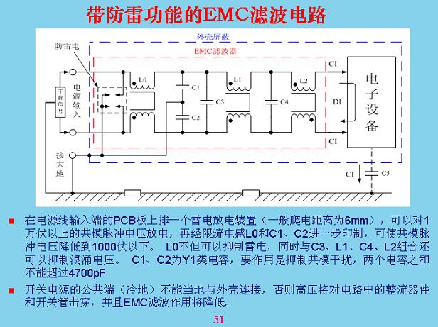 按照道理EMI是電磁干擾,避雷元器件按照道理并不聯(lián)系在一起,但EMC濾波里面,與EMC濾波器同樣有防雷功能,就是前面的幾個(gè)電感和共模電容還有差模電容對(duì)防雷都起到作用,大家要理解,EMC濾波是用于設(shè)備上的,但反過(guò)來(lái)考慮雷電的時(shí)候,你就要把干擾信號(hào)從外面輸進(jìn)來(lái),要這樣考慮了,不能單方面,最好在防雷加上一個(gè)放電裝置加在電感后面,共用共模濾波電容。