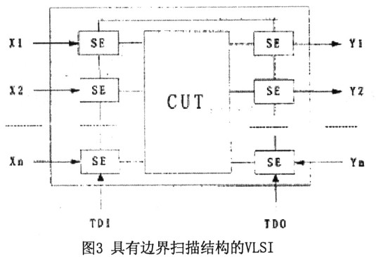 邊界掃描的基本思想是在靠近待測(cè)器件的每一個(gè)輸入/輸出管腳處增加一個(gè)邊緣掃描單元,并把這些單元連接成掃描鏈,運(yùn)用掃描測(cè)試原理觀察并控制待測(cè)器件邊界的信號(hào)。在圖3中,與輸入節(jié)點(diǎn)X1,X2…、Xm和輸出節(jié)點(diǎn)Y1,Y2…、Ym連接的SE即為邊界掃描單元,它們構(gòu)成一條掃描鏈(稱為邊界掃描寄存器一BSR),其輸入為T(mén)DI(TestDataInput),輸出TD0(TestData0ut)。在測(cè)試時(shí)由BSR串行地存儲(chǔ)和讀出測(cè)試數(shù)據(jù)。此外,還需要兩個(gè)測(cè)試控制信號(hào):測(cè)試方式選擇(TestModeSelect—TMS)和測(cè)試時(shí)鐘(TestC1ock—TCK)來(lái)控制測(cè)試方式的選擇。