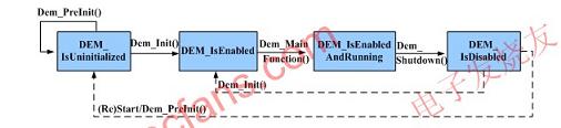 DCM模組遵循的標(biāo)準(zhǔn)與DCM相同,負(fù)責(zé)直接處理與DTC相關(guān)的服務(wù),如UDS中的0x19服務(wù)(響應(yīng)報(bào)文由DCM發(fā)送出去)。當(dāng)軟體構(gòu)件中的MonitorFunction檢測(cè)到故障或BSW模組檢測(cè)到故障時(shí),將通知DEM模組處理和儲(chǔ)存‘診斷事件’(由EventID進(jìn)行標(biāo)識(shí))。如果故障確診,唿叫NVRAMManager(非揮發(fā)性記憶體管理器)提供的介面將其存取到非揮發(fā)性記憶體中,同時(shí)通知應(yīng)用層進(jìn)行故障指示。DEM的狀態(tài)圖如圖3所示:
