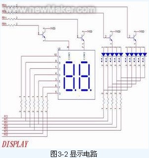 系統(tǒng)共有2位七段數(shù)碼管顯示及10個(gè)發(fā)光二極管顯示。數(shù)碼管主要有6種狀態(tài)需要顯示:待機(jī)狀態(tài)、出錯(cuò)顯示、燜飯、保溫、煮飯中及定時(shí)時(shí)間顯示。發(fā)光二極管顯示所選擇的功能、開始及保溫狀態(tài)。功能顯示需采用輪循方式,在按下開始鍵之前,開始燈閃爍。進(jìn)進(jìn)保溫狀態(tài)后,保溫指示燈亮。LED顯示程序由位碼掃描子程序及數(shù)碼顯示狀態(tài)選定子程序組成。