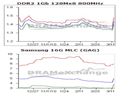 從DDR3來看,市場(chǎng)已經(jīng)聞風(fēng)而動(dòng),顆粒價(jià)格有明顯上升的勢(shì)頭,尤其是金士頓內(nèi)存(見下表),未來一段時(shí)間內(nèi)價(jià)格有可能繼續(xù)上揚(yáng)。一些經(jīng)銷商預(yù)計(jì)閃存價(jià)格地震后將出現(xiàn)15%以上的漲幅,已經(jīng)開始小幅提價(jià),并出現(xiàn)了惜售的心態(tài)。目前甚至不排除部分經(jīng)銷商囤貨了。