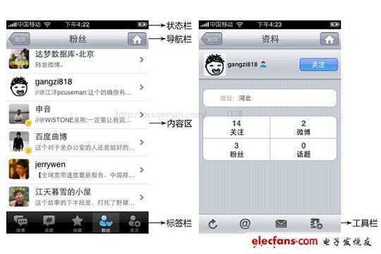 首先iPhone只有一個物理按鍵Home,而這個按鈕主要是在系統(tǒng)級操作上起到一些作用,在一個應(yīng)用中,絕大多數(shù)情況都是退出功能。在480x320這個對手機(jī)而言很大的屏幕上要包括以下3個模塊,才能對一個App進(jìn)行操作。