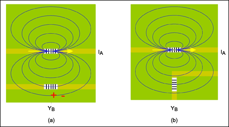 式中,YB是向電路B注入的誤差電壓,IA是在電路A作用的電流1。LM對(duì)電路間距、電感環(huán)路面積(即磁通量)以及環(huán)路方向非常敏感。因此,緊湊的電路布局和降低耦合之間的最佳平衡是正確排列所有電感的方向。