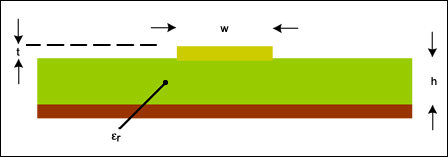 式中,εr為電介質(zhì)的介電常數(shù),h為引線距離地層的高度,w為引線寬度,t為引線厚度(圖7)。w/h介于0.1至2.0、εr介于1至15之間時(shí),該公式的計(jì)算結(jié)果相當(dāng)準(zhǔn)確。