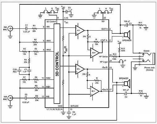 圖1所示的立體聲聲頻子系統(tǒng),是一個包含立體聲聲頻喇叭加耳機和3D增強裝置的放大器。也就是說,這個裝置具有立體聲喇叭及立體聲耳機驅(qū)動功能。當電源電壓Vcc=5V時,立體聲喇叭最大輸出量可達到1.3W。當每個通道在8Ω負載下、而負載降至3Ω時,則可支援每個通道達2.1W的輸出量,而耳機能夠在32Ω負載下輸送高達80mW至每個通道。此子系統(tǒng)利用兩個獨立的控制接腳來控制停機和3D開關(guān),操控方便,設(shè)計簡單,并提供耳機檢測功能。
