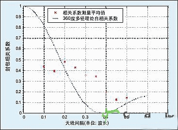 利用所開發(fā)的硬件測(cè)試平臺(tái)進(jìn)行了廣泛的測(cè)量,包括手機(jī)分集測(cè)量、天線間隔和操作員身體對(duì)分集的影響、自適應(yīng)波束形成、到達(dá)角、信道互易驗(yàn)證,以及寬帶向量信道測(cè)量。圖5和圖6給出了戶外非直線可視信道的采樣分集測(cè)量。圖5對(duì)比相對(duì)于天線間隔的相關(guān)系數(shù),注意到當(dāng)相關(guān)性遠(yuǎn)低于0.7時(shí)將十分有利于提高分集性能。圖6給出了分集增益與天線間隔的函數(shù)關(guān)系:99%可靠性時(shí),增益約9dB;90%可靠性時(shí),增益約5-dB。當(dāng)間隔降至0.1波長(zhǎng)時(shí),幾乎沒有關(guān)聯(lián)關(guān)系了。