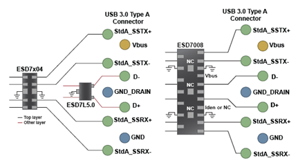 此外,還有針對(duì)消費(fèi)產(chǎn)品的USB 3.0器件(ESD7008、ESD7104、ESD7004和ESD7L)。這些器件符合電容低于0.5 pF要求,提供最低0.15 pF的超低電容,采用穿越型(flow-through)布線,提供領(lǐng)先業(yè)界的低鉗位電壓。