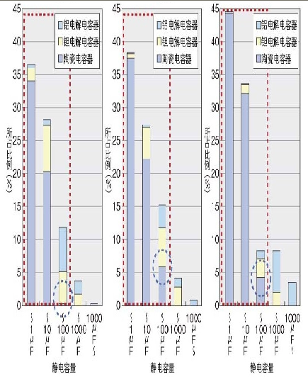 圖2:大容量產(chǎn)品的所占比例按照不同的靜電容量對(duì)電容器的總需求進(jìn)行了統(tǒng)計(jì),分別明確了片狀獨(dú)石陶瓷電容器、鋁電解電容器、鉭電解電容器各自所占比例?!?/p>
