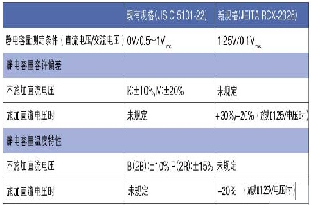 在靜電容量的測(cè)定上,新規(guī)格改為在施加1.25V直流電壓和0.1Vrms交流電壓的狀態(tài)下對(duì)容量進(jìn)行測(cè)定。而原來的“JIS C 5101-22”規(guī)格并不要求施加直流電壓,只是要求在施加0.5~1Vrms交流電壓的狀態(tài)下對(duì)容量進(jìn)行測(cè)定?! ?br />