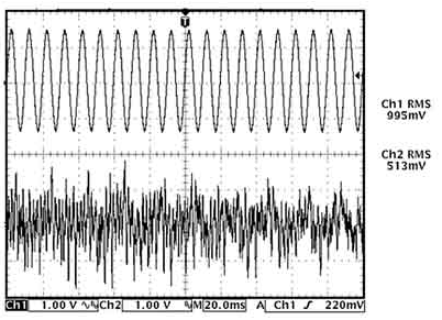 常見的音源,包含樂音和語音,其RMS值往往比峰值輸出功率低得多。通常情況下,語音的峰值與RMS功率之比(即波峰因數(shù))為12dB,而樂音的波峰因數(shù)為 18~20dB。圖1為時域內(nèi)音頻信號和正弦波的波形圖,給出了采用示波器測量兩者RMS值的結(jié)果。雖然音頻信號峰值略高于正弦波,但其RMS值大概只有正弦波的一半。同樣,音頻信號可能存在突變,但正如測量結(jié)果所示,其平均值仍遠(yuǎn)低于正弦波。雖然音頻信號可能具有與正弦波相近的峰值,但D類放大器表現(xiàn)出來的熱效應(yīng)卻大大低于正弦波。因此,測量系統(tǒng)的熱性能時,最好使用實際音頻信號而非正弦波作為信號源。如果只能使用正弦波,則所得到的熱性能要比實際系統(tǒng)差。