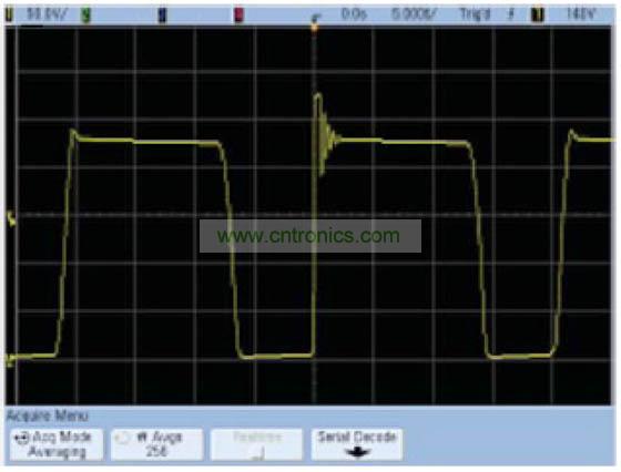 這種算法在垂直分辨率為12位時(shí)效果最好,因?yàn)樵倮^續(xù)增加下去,其他因數(shù)(例如示波器的垂直增益或偏置精度)將起到?jīng)Q定性作用。平均模式的優(yōu)點(diǎn)是,它對(duì)示波器的實(shí)時(shí)帶寬沒(méi)有任何限制。缺點(diǎn)是它要求使用重復(fù)性信號(hào),并會(huì)降低波形更新速率。在正常采集模式下與平均模式下捕獲的開關(guān)電源的Vds分別如圖1和圖2所示。