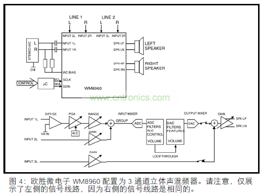 WM8960 提供了全面的內(nèi)部路由選項,表 1 顯示了路由輸入有多么靈活。案例 2 描述了圖 4 所示的信號路徑路由。