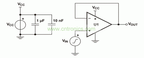 圖 3 用于評(píng)估VICMR的單電源電壓跟隨器電路