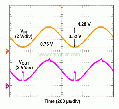 VIN稍稍增加至3.52 Vp-p,VOUT便開(kāi)始在正(5V)和負(fù)(0V)軌附近呈現(xiàn)非線性行為(圖5)。VIN進(jìn)一步增加至4.2 Vp-p,明顯超出VICMR。由于輸入峰值在正軌附近超出限制,因此其上跳至正軌(5V),并在VIN返回到某個(gè)可接受范圍以前一直保持在該狀態(tài),最終VOUT信號(hào)出軌(圖6)。隨著輸入降至負(fù)軌附近限制以下,VOUT信號(hào)表現(xiàn)出倒相,同時(shí)其跳至中軌(2.5V),并在VIN增加到VICMR范圍內(nèi)某個(gè)可接受電壓水平以前,一直通過(guò)偏壓來(lái)跟隨VIN。