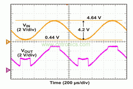 為了測(cè)試該電路,我們將VCC/2 = 5V DC偏移的300 Hz正弦波應(yīng)用于輸入端。在VOUT出現(xiàn)變化以前,一直對(duì)AC幅值進(jìn)行調(diào)節(jié)。如圖4所示,當(dāng)應(yīng)用10 Vp-p輸入時(shí),VOUT在正軌附近出現(xiàn)一個(gè)經(jīng)削波的信號(hào),而非負(fù)軌附近。如果輸入超出VCC – 0.8V(本例中為9.2V),這種正軌附近出現(xiàn)的非理想行為是我們能夠預(yù)計(jì)到的。9.2V以下VIN電平和低至0V時(shí),VOUT顯示出正確的波形,正如我們所預(yù)期的那樣。