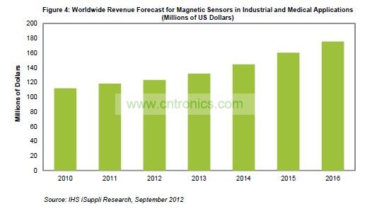 2011年工業(yè)與醫(yī)療磁性傳感器營業(yè)收入為1.182億美元,而2010年是1.119億美元。盡管該領(lǐng)域的營業(yè)收入少于汽車和無線-消費等其它磁性傳感器領(lǐng)域,但將促進未來幾年傳感器市場持續(xù)擴張。到2016年,這個磁性傳感器領(lǐng)域的營業(yè)收入將增至1.755億美元,如圖所示,五年復(fù)合年度增長率為8%。