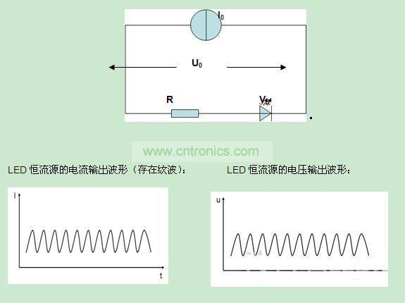 假設(shè)LED驅(qū)動(dòng)此時(shí)輸出的電流值I0為100mA,R=10Ω,二極管導(dǎo)通電壓Vd=30V,那么實(shí)際的LED燈拉載時(shí),LED驅(qū)動(dòng)的輸出電壓U0=100mA*10Ω+30V=31V,輸出為31V/100mA。假設(shè)恒流源的輸出電流紋波為10mA, LED驅(qū)動(dòng)的輸出電壓紋波實(shí)為10mA*10Ω=0.1V。