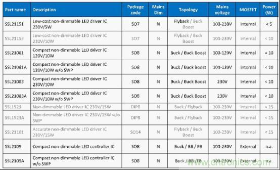 圖1 NXP中小功率市電供電非調(diào)光LED驅(qū)動(dòng)IC選型表格