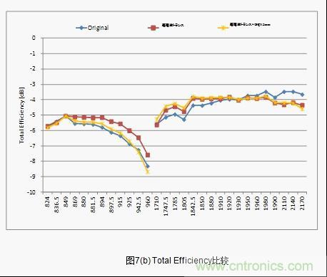 接下來將針對天線小型化的有效性進(jìn)行檢測。一般來說天線具有改善接地距離的特性。但是,天線占據(jù)空間(排除了GND領(lǐng)域)很大的話天線以外的 元器件安裝空間就會(huì)受壓迫。天線小型化和縮小天線空間迫在眉睫。當(dāng)天線空間的一部分被GND占據(jù),對這時(shí)候的天線特性的變化進(jìn)行評價(jià)。天線空間的寬度為52mm,其中13mm被GND占據(jù),low band的特性劣化,變成了跟LC電路等同的Total Efficiency(圖7(b))。這就意味著實(shí)際上天線空間的面積可減少25%。