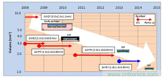 圖4所示是村田SAW雙工器產(chǎn)品尺寸的變遷。從舊的空腔3025尺寸(3.0×2.5mm),到后來通過確立樹脂封止方法將CSP型號成功產(chǎn)品化,實現(xiàn)了小型化。再后來,通過改善電極設計和加工技術,繼續(xù)完善對小型化的完善。于是,2013年成功地將1814尺寸 (1.8×1.4mm)的CSP型號SAW雙工器產(chǎn)品化。它比現(xiàn)在主流的2016尺寸(2.0×1.6mm)還要再減少20%的搭載面積,成為了支撐今后搭載頻帶數(shù)量增加的新技術。