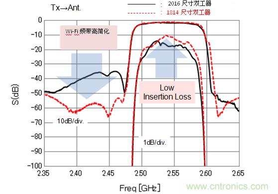 圖5所示為Band7用的2016尺寸和1814尺寸的雙工器的傳輸端特性比較。為了跟Wi-Fi系統(tǒng)共存,必須在Wi-Fi頻帶中進行高減衰的Band7雙工器2016尺寸的基礎上進行了改善。傳輸端的傳送特性是在Wi-Fi頻帶中進行高減衰、實現(xiàn)了Band7傳輸頻帶的低插入損耗的目標。雖然受到了1814尺寸小型化設計自由度的限制,我們還是注重了電極設計的舒適化、同時在芯片布局上花了足夠的心思,所以Band7的特性超越了2016尺寸。