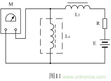 這里順便說明,采用圖7測試時應該注意的地方。圖7中,隔離電感LT的數值要求是測試電感Lx數值的3倍以上,并且測量高壓包初級線圈的初始電感值L0時,最好也要接入電路之中。這里,隔離電感LT可選取20毫亨以上的矽鋼片直流電感,電感的鐵芯要留有氣隙;流電源可用一個穩(wěn)壓電源與一個大功率電阻串聯(lián)代替,如圖11,或用一個穩(wěn)壓電源與一個大功率晶體放大器串聯(lián)來代替,如圖12。