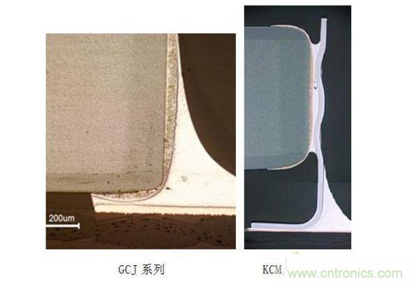 GCM系列的話,在1000°溫度循環(huán)的情況下會發(fā)生焊接裂縫,而KCM/KC3系列的話即使在2000°溫度循環(huán)的時候也看不見焊接裂縫,可見對于熱應力可確保高可靠性。