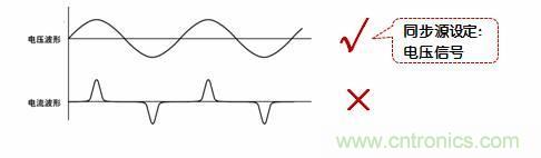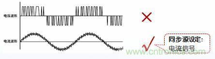 當(dāng)被測對象是變頻器,其電流波形的畸變相比電壓波形較小時,請選擇電流信號作為同步源。