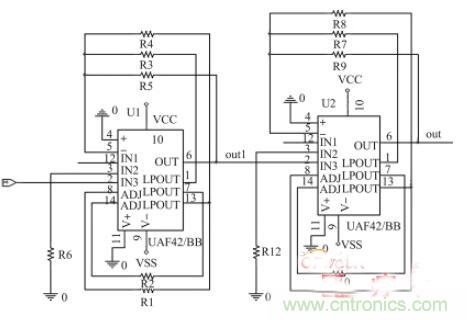 采集電路拾取的心電信號(hào)中有低頻的基線漂移和高頻干擾,還有在心電信號(hào)頻率范圍內(nèi)的50 Hz 工頻干擾,這些噪聲對(duì)心電信號(hào)提取的影響非常大。設(shè)計(jì)了基于通用有源濾波模塊UAF42 的帶通