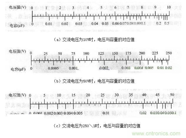 注意:(1)如果待測電容的電容量超出萬用表測量范圍,則不能用數字式萬用表測量。(2)數字式萬用表的表筆連接與指針式萬用表的表筆連接方法是相反的,指針式萬用表黑表筆接的是表內 電源正極,為表內電流流出端;數字式萬用表的紅表筆接表內電源正極,為表內電流流出端。電容充分放電后將萬用表紅表筆接電解電容正極,黑表筆接電解電容負極可測出正向絕緣電阻。反之,萬用表紅表筆接電解電容負極,黑表筆接電解電容正極可測出反向絕緣電阻。(3) 萬用表電壓法檢測電容用交流電壓法也可以檢測電容器,某些萬用表帶有此功能,如FM50型萬用表。下面以FM50型萬用表為例,其檢測方法如下。萬用表的刻度盤上有交流電壓與電容容量相對應的刻度,如圖6所示。