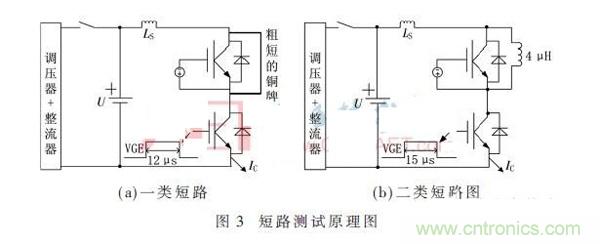 圖3(a)為一類短路測(cè)試原理圖,電網(wǎng)電壓經(jīng)過調(diào)壓器和整流橋,將母線電容電壓充到1 500 V,上管igbt的門極被-15 V關(guān)斷,且用粗短的銅排將其短路。對(duì)下管的IGBT釋放一個(gè)12 μs的單脈沖,直通就形成一類短路。圖3(b)為二類短路測(cè)試原理圖,將母線電容電壓同樣充到1 500 V,上管IGBT的門極被-15 V關(guān)斷,且給上管并聯(lián)一個(gè)4 μH的電感作為負(fù)載,下橋臂通過IGBT驅(qū)動(dòng)器釋放一個(gè)15 μs的單脈沖就形成二類短路。
